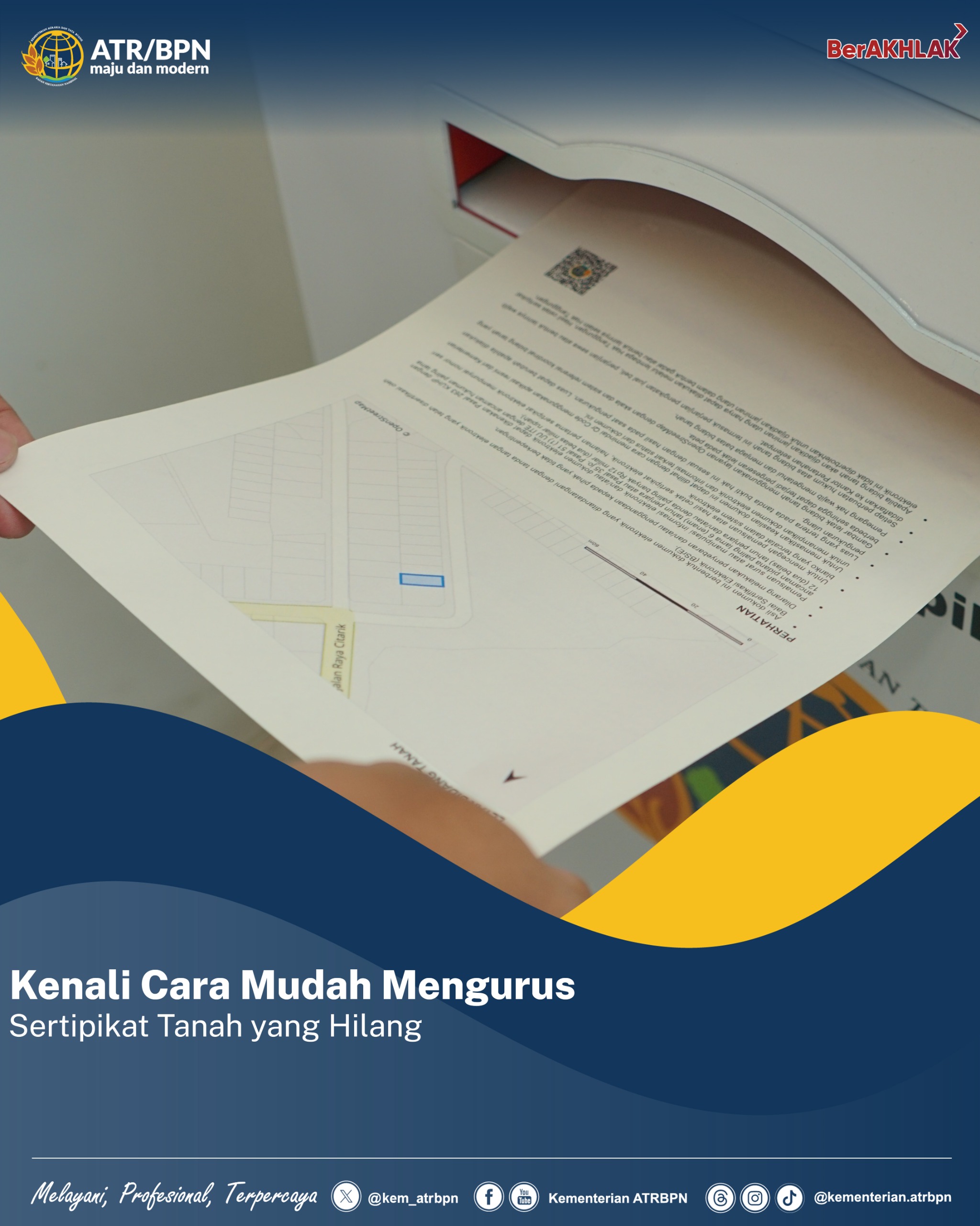 Informasi lebih lengkap terkait pengurusan sertipikat tanah yang hilang juga dapat diperoleh masyarakat secara _online_ melalui aplikasi Sentuh Tanahku. Aplikasi Sentuh Tanahku dapat diunduh, baik pada Playstore maupun Appstore dari masing-masing gadget pemilik tanah. (Adv)