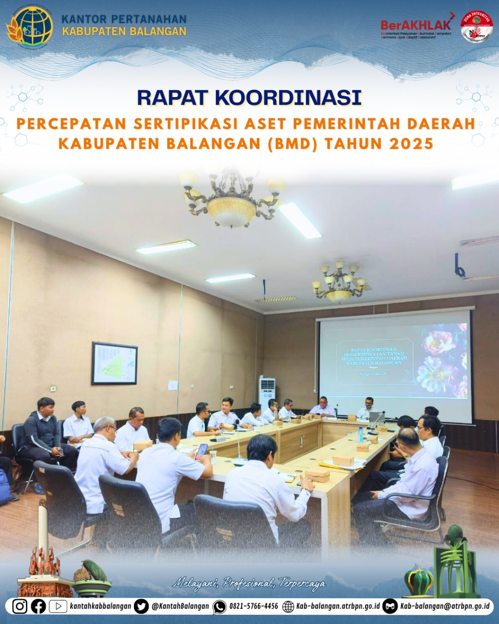 Balangan, 2 Juli 2025 — Kantor Pertanahan Kabupaten Balangan menghadiri Rapat Koordinasi Percepatan Sertipikasi Aset Pemerintah Daerah (Barang Milik Daerah/BMD) yang diselenggarakan oleh Badan Pengelolaan Keuangan, Pendapatan, dan Aset Daerah (BPKPAD) Kabupaten Balangan.