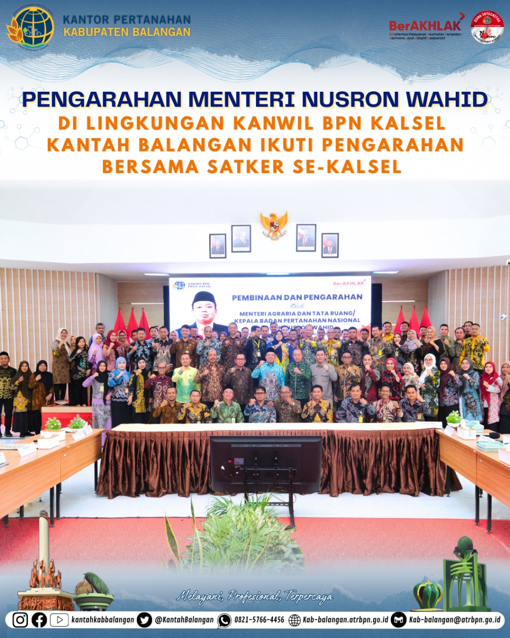 Banjarbaru, 31 Juli 2025 – Kantor Pertanahan Kabupaten Balangan turut menghadiri kegiatan pengarahan yang disampaikan langsung oleh Menteri Agraria dan Tata Ruang/Kepala Badan Pertanahan Nasional (ATR/BPN), Bapak Nusron Wahid, di Aula Kantor Wilayah BPN Provinsi Kalimantan Selatan.