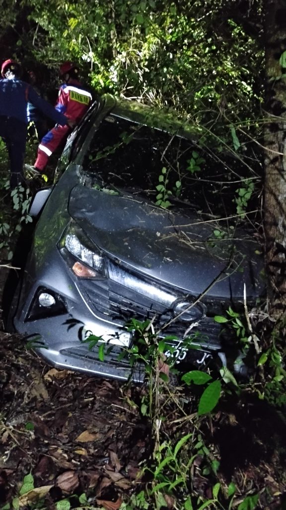 Mobil Daihatsu Sigra milik Daniel tampak tersangkut di pohon akasia usai terperosok ke jurang di Bunglai, Aranio