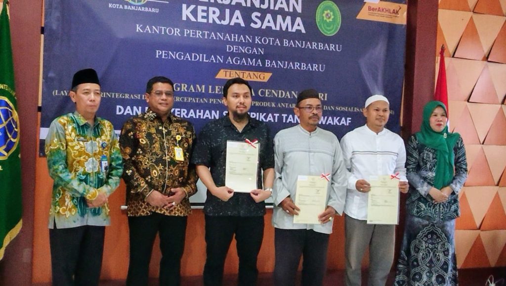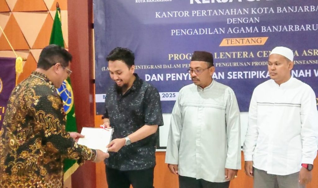 BANJARBARU, borneoinfonews.com – Proses sertifikasi tanah wakaf untuk Masjid Ar-Rahman di Jalan Karang Anyar II, Banjarbaru, berhasil diselesaikan hanya dalam waktu satu pekan. Sebanyak 14 sertifikat tanah diserahkan langsung oleh Kepala Kantor ATR/BPN Banjarbaru kepada pengurus masjid, Jumat (8/8/2025), usai penandatanganan perjanjian kerja sama (PKS) antara ATR/BPN dan Pengadilan Agama Kota Banjarbaru.