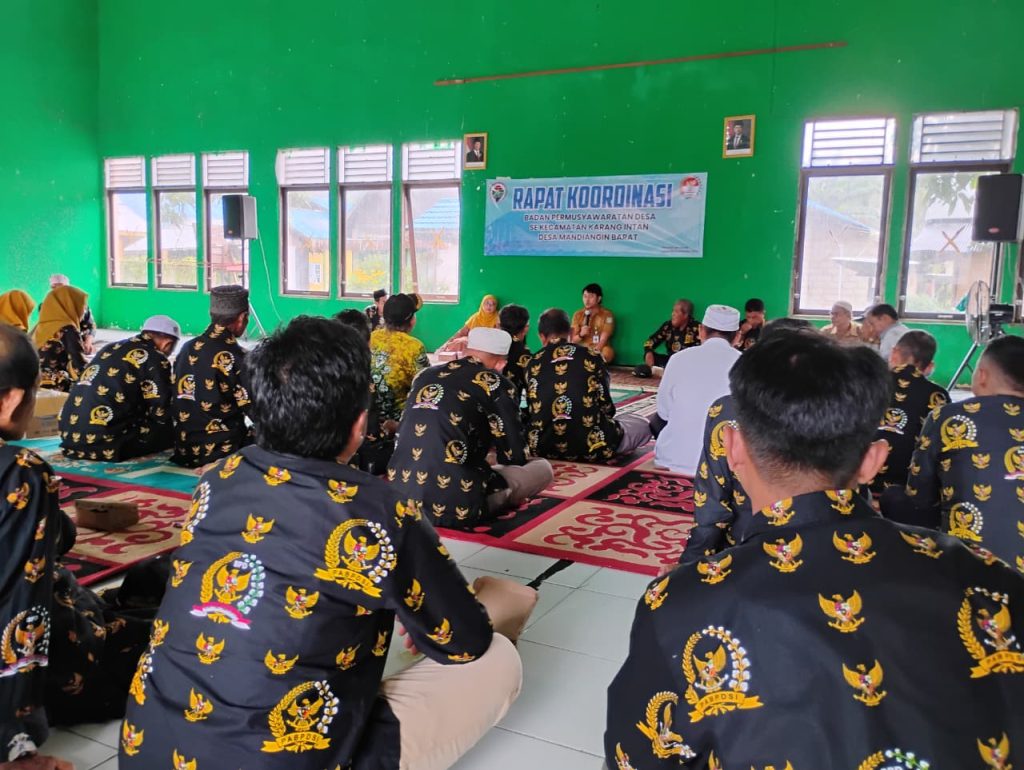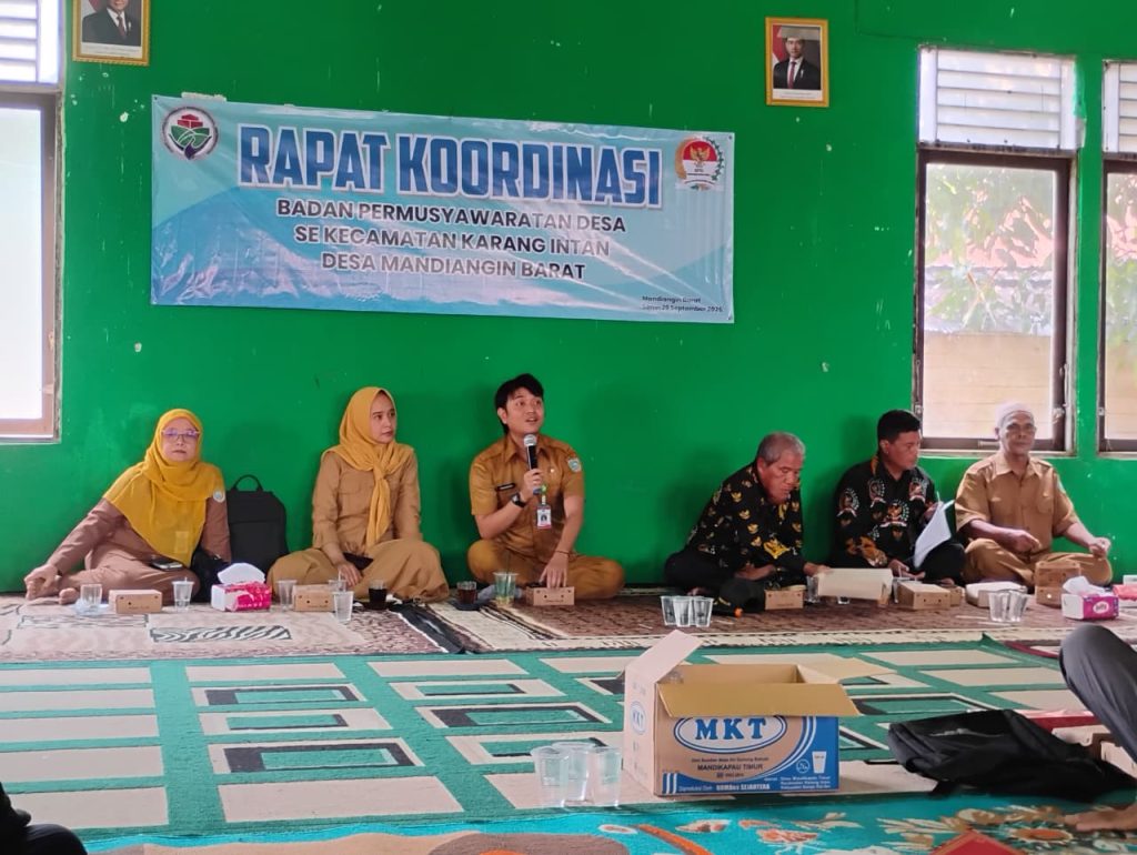 Suasana rapat koordinasi empat bulanan BPD se-Kecamatan Karang Intan yang digelar di Gedung Serbaguna Desa Mandiangin Barat, Senin (29/9/2025). Foto: Rasyad